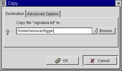 Just as you can copy a file by right-clicking, so too, you can move a file by right-clicking on it and selecting Move from the menu which appears. If you want to rename the file while moving or copying it, type its new name in the Copy or Move box which opens. For example, if you want to copy the file signature.txt to /home/newuser/tigger and rename it backup.txt, you would type /home/newuser/tigger/backup.txt. |