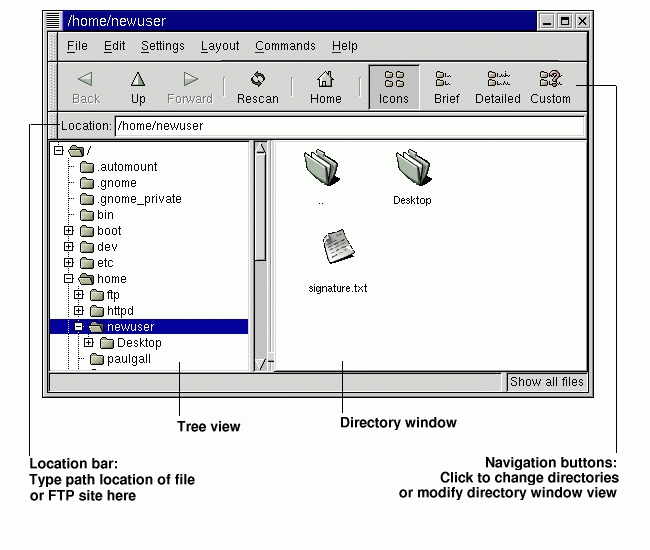 As a new user, it's unlikely you'll find many new files or directories when you first open the file manager. That's because by default, GMC opens in your login directory. Note the file signature.txt, however, in Figure 9-1. This is the signature file the user newuser created while configuring Netscape Messenger.