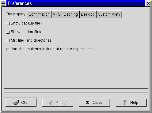 File display -- Modify the way files are viewed. Select Show backup files to reveal backup files; Show hidden files to show dot files, usually configuration files and directories; Mix files and directories allows you to see files and directories in an order you select in the directory window; you don't really have to concern yourself with the Use shell patterns... choice, because it concerns sorting with regular expressions, which is probably more useful to advanced users.