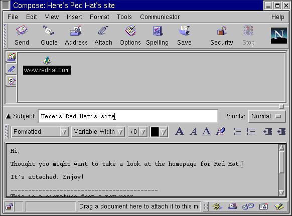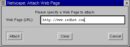 You can drag files from your desktop or from your file manager in the same way that you can drag URLs from Navigator. Just hold your mouse button over the file you want to attach, and drag it to the attachments field of your letter. |