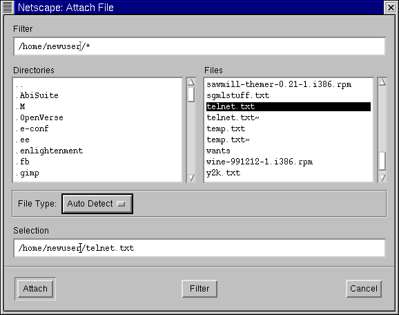 In the same way that you attach Web pages to your letter, you can attach files on your computer. When you select Attach from the Toolbar or beneath the address field, choose File from the menu. The Attach File dialog will open, showing you the contents of your login directory (see Figure 7-16).