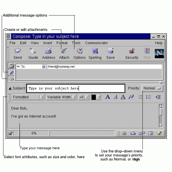 Now, type the body of your letter. When you're finished, click on the Send icon on the Toolbar to send your e-mail.