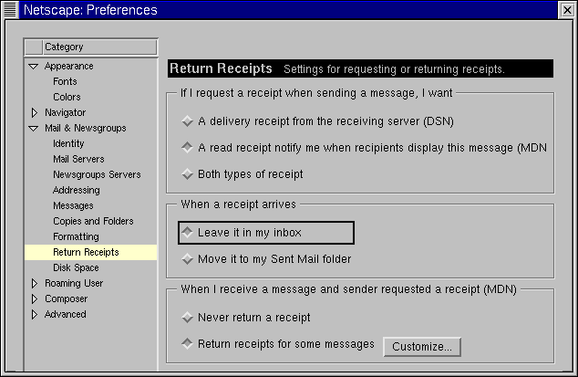 To specify preferences for return receipts, go to Edit => Preferences => Mail & Newsgroups => Return Receipts. In the dialog which opens (see Figure 7-17), choose how you want to use return receipts for mail you send and mail you receive.