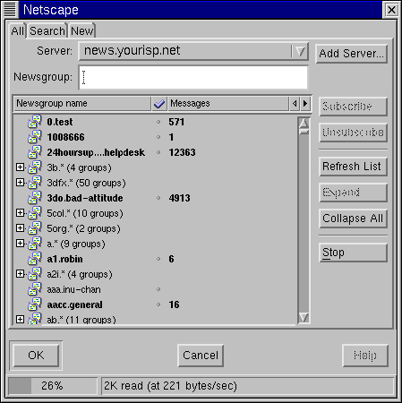 Your next task is to download the list of newsgroups from your ISP's news server, and to subscribe to those groups in which you have an interest. Be prepared: Depending on the speed of your connection, downloading the list of many thousands of newsgroups can take some time. While you wait for the complete list, you may have enough time to make a pot of coffee, phone a friend -- or read a novel (just kidding).