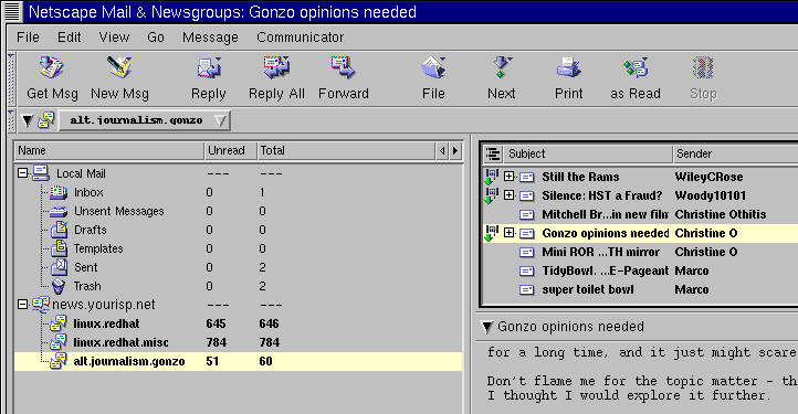 To read newsgroups, you'll need a news reader. One such news reader is Messenger, which lets you read and post to newsgroups similar to the way you work with e-mail.