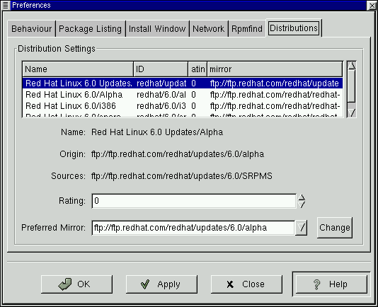 In Distribution Settings, you can set the options for choosing the most appropriate package out of the selections Rpmfind returns, as well as which mirror you would like to use. The higher the rating you indicate for your selection (as shown in Figure 10-6) the higher the priority it will receive; the lower rating, such as "-1," will specify that packages not be recommended.
