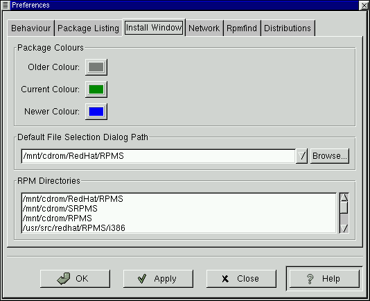 Note, however, that there is a selection of paths beneath the default choice, as well as a Browse… button next to the default path. The window listing the RPM Directories contains a listing of the most likely locations in which RPM files would be found on your system. By selecting the Browse… button, you can also specify an entirely different path. Once a new path is selected, click on the Apply button to save your default path for future sessions.