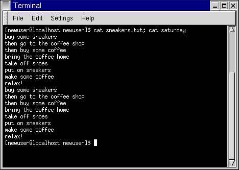 The contents of both files will be displayed - first sneakers.txt, then saturday (as shown in Figure 13-14).