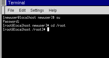 [newuser@localhost newuser]$ su Password:your root password [root@localhost newuser]#cd /root [root@localhost /root]# |