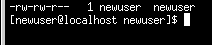 There's quite a bit of detail here. We can see who can read (r) and write to (w) the file, as well as who created the file (newuser) and to which group the owner belongs (newuser).