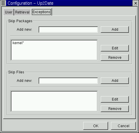 The Exceptions tab allows you to specify packages or individual files which you don't want retrieved from priority.redhat.com and offered as an update. (See Figure 11-5 for an example of this tab.)