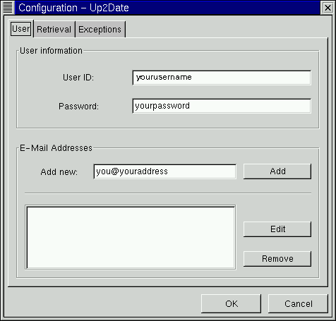 In the E-Mail Addresses section, you should specify the e-mail address to which feedback and summaries from Update Agent should be sent for review. You can have the feedback and summaries sent to numerous accounts, such as your user account. Just enter the addresses in the Add new box, then click on the Add button. The entry will appear in the address window.