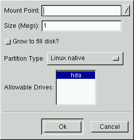Partition Type: This field contains a list of different partition types (such as Linux Native or DOS). Select the appropriate partition type by using the mouse.