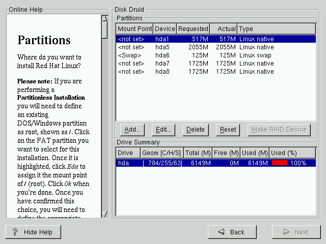 If you have not yet planned how you will set up your partitions, refer to the partitioning appendix in the Official Red Hat Linux Reference Guide. As a bare minimum, you'll need an appropriately-sized root partition, and a swap partition of at least 16 MB. |