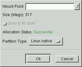 Mount Point: Highlight and enter the partition's mount point. For example, if this partition should be the root partition, enter /; enter /boot for the /boot partition, and so on. You can also use the pull-down menu to choose the correct mount point for your partition.