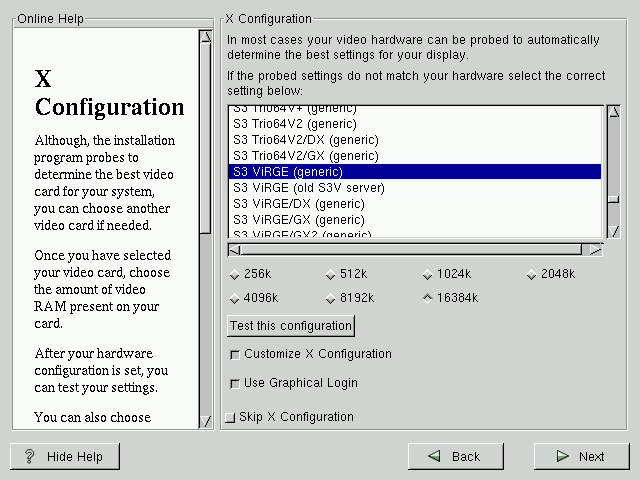 Next, Xconfigurator prompts you for the amount of video memory installed on your video card. If you are not sure, please consult the documentation accompanying your video card. You will not damage your video card by choosing more memory than is available, but the XFree86 server may not start correctly if you do.