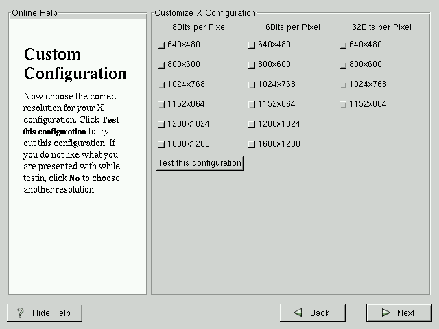 If you would like to customize the X configuration, please make sure the Customize X Configuration button is selected. If you choose to customize, you will be presented with another screen that lets you select what your resolution should be (see Figure 4-19). Again, you will have the option of testing the configuration.