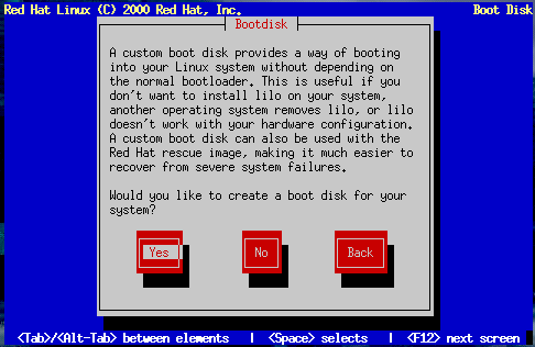 For instructions on how to create a boot disk after the installation, read the mkbootdisk man page. Be sure you create a new boot disk if you make any changes to your kernel.