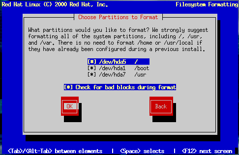 When you have selected the partitions to format, press Space. If you wish to check for bad blocks while formatting each filesystem (recommended for those with older disk drives), select Check for bad blocks during format. Select OK, and press Space.