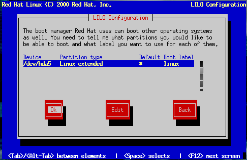 There is also a column labeled Default. Only one partition will contain an asterisk under that column. The partition marked as the default will be the partition LILO will boot if there is no user input during the boot process. Initially the root partition for your Red Hat Linux installation will be selected as the default. If you'd like to change this, use the arrow keys to highlight the partition you'd like to make the default, and press F2. The asterisk will move to the selected partition. When you've finished, select OK, and press Space.