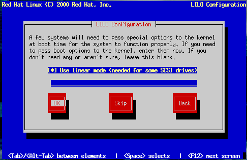 If you choose Skip, you will not be able to boot your Red Hat Linux system directly, and will need to use another boot method (such as a boot disk). Use this option only if you are sure you have another way of booting your Red Hat Linux system! |