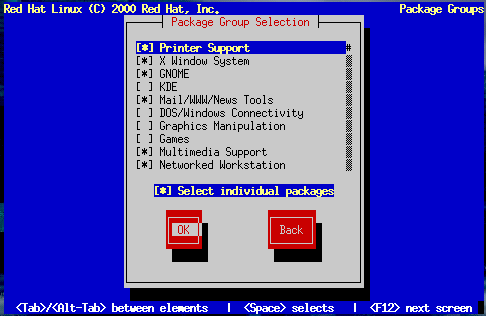Note that some packages that are required for every Red Hat Linux system (such as the kernel and certain libraries) do not appear in the package selection dialogs.