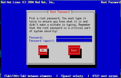 The root password must be at least six characters long; the password you type is not echoed to the screen. You must enter the password twice; if the two passwords do not match, the installation program will ask you to enter them again.